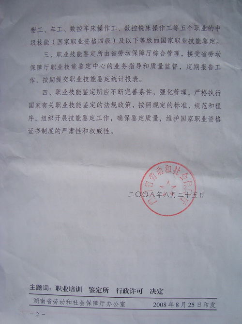 为落实党中央、国务院提出的“科教兴国”的战略方针,积极推行学历文凭与职业资格证书并重的制度,凸显公司应用型本科院校的办学特色,把老员工培养成知识技能型、技术复合型、专业适应型人才,2008年6月,公司向湖南省劳动和社会保障厅申请设立“bevictor1946韦德官网国家职业技能鉴定所”, 开展维修电工、数控车床操作工、数控铣床操作工、钳工、车工等五个工种的初、中级职业技能培训鉴定工作。2008年7月20日,湖南省劳动和社会保障厅职业技能鉴定指导中心专家组莅临公司工程训练中心进行了现场评审。专家组听取了成立鉴定所的情况汇报,考察了工程训练中心实训设备等设施。最后经省劳动和社会障厅综合评审,批准公司设立“bevictor1946韦德官网国家职业技能鉴定所”。
